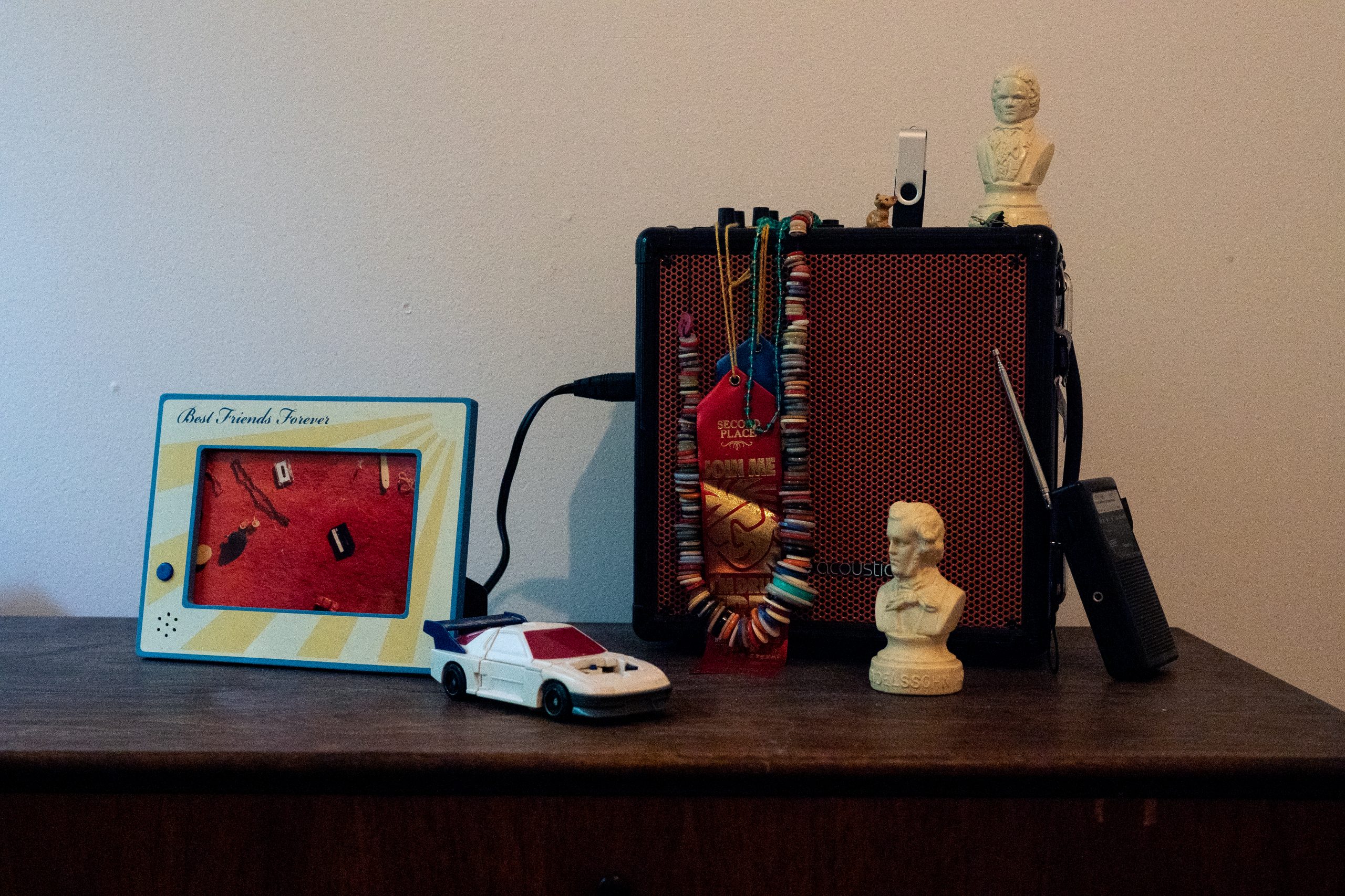 BOUNDARYMIND is a long-distance collaborative project by Linda Jankowska and Katherine Young. The evening-length electroacoustic sound piece and aggregating multi-media installation explores and transgresses the geographical, cultural, psychological, and musical boundaries that impact how we share—and modulate—our past, present, and future selves through collection and interaction with our material world. Every-day objects with sentimental meaning and memory-evoking power have been shared—recorded and remixed, filmed and animated, collected and woven into a three-dimensional tapestry. When the piece is fully realized—performed and installed for in-person experience—these objects and sounds, weaving by Molly Roth Scranton and film by Kera MacKenzie, are installed into an immersive space, and audience members are invited to contribute their own objects-memories-sounds. In 2021 we released aspects of the work into the world through a storefront installation at Roman Susan in Chicago, online performances at ESS Quarantine Concerts series and SEAMUS conference, and a Call-for-Home Recordings disseminated via the Internet and radio stations.